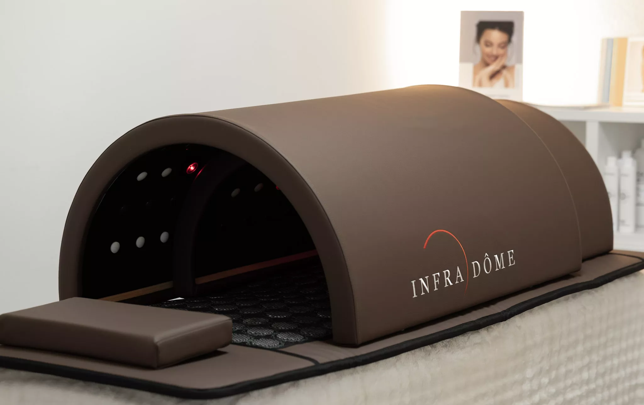 L’Infra Dôme est un sauna japonais de nouvelle génération conçu pour offrir une expérience esthétique complète, alliant technologie infrarouge longue fréquence et plus de 300 pierres minérales. Compact, télescopique et simple à intégrer dans n’importe quel institut, il s’installe directement sur une table d’esthétique sans encombrer l’espace.